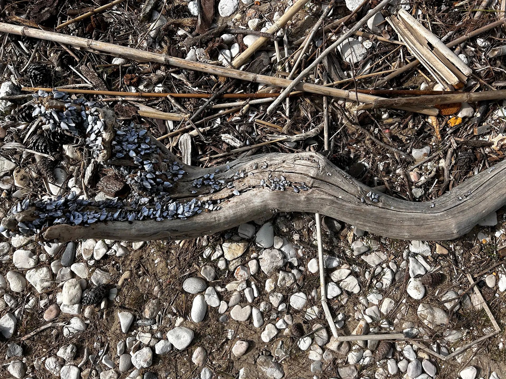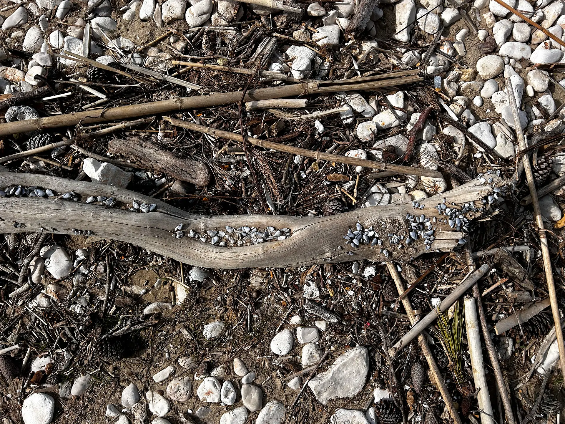 Ima ih mnogo no ova mi je zapela za oko jer je bila tako zasićena školjkicama. Naplavine su već teksturirane tokom svojeg života pod morem u kojem su se predale morskim silama i prilikama. Onda im se na tu površinsku teksturu nakite i ove male školjkice koje se rasipaju u svoje kolonije. Od naplavina kreativci stvaraju slike i kipove, jer more već pola posla odradi za njih i oni u tim oblicima pronalaze inspiraciju. Meni je ova, ovako posipana malim školjkicama umjetnina sama za sebe.